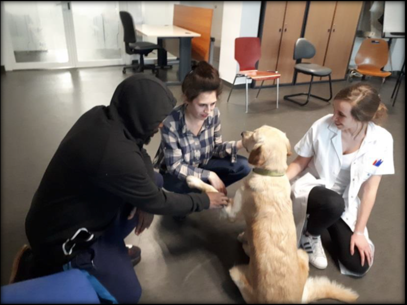 Convaincus du bienfait que peuvent apporter les animaux et dans un objectif de développer des méthodes innovantes pour améliorer la prise en charge et la qualité de vie des patients, nous avons construit le projet de médiation animale. Il s'agit d'un atelier thérapeutique basé sur l'interaction patient-soignant-chien à travers le jeu, le dressage, le soin… Ces groupes sont animés par une équipe pluridisciplinaire composée d'infirmières, d'une aide soignante, d'une ergothérapeute et d'une intervenante extérieur psychologue. Par le biais de Nova (golden retriever) et de l'étayage soignant, nous essayons de mettre en lien ces patients présentant des difficultés d'interactions sociales, un repli sur soi, un désinvestissement du corps. De la main à la patte il n'y a qu'un pas…
