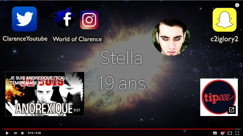 World Of Clarence est une chaîne Youtube de vidéos artistiques tenue par un étudiant en soins infirmiers, titulaire d’une formation d’acteur, de mise en scène et d’une licence de psychologie. Ces vidéos accessibles au grand public mettent en scène les témoignages authentiques de personnes atteintes de psychoses (ou d’autres pathologies mentales) et/ou de maladies somatiques et/ou victime de traumatismes (viols, harcèlements …).