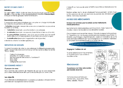 A l’hôpital de jour du pôle 16 du GHU Paris Psychiatrie et Neuroscience, l’Unité Psycho-sociaux (UPS) est née avec un groupe de « rétablissement » avec les patients. Durant les séances, une brochure a été réfléchie dont la visée est d’informer toute personne étrangère au service sur le fonctionnement de l’HDJ. Nous espérons que ce projet permettra une plus grande participation des usagers dans leur rétablissement afin de se responsabiliser face au défi de la maladie. Dans notre cas, cela nous a permis de développer de l’empathie envers nos pairs et l’envie d’aller vers l’autre pour donner de l’espoir aux patients.