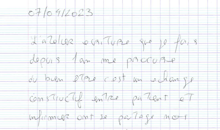 « Le livre nous a permis de mettre et d’écrire nos émotions que l’on a ressenties dans l’univers de la psychiatrie. L’atelier écriture a aidé à m’exprimer sur des sujets qui nous ont touchés dans notre vie. J’aimerai que ce livre soit lu, car je pense qu’il apportera aux lecteurs un regard autre que les préjugés que l’on a sur la maladie et la vie dans le monde psychiatrique. Les témoignages des patients sont autobiographiques, et peuvent aider à mieux cerner les différentes pathologies des patients.» Michou